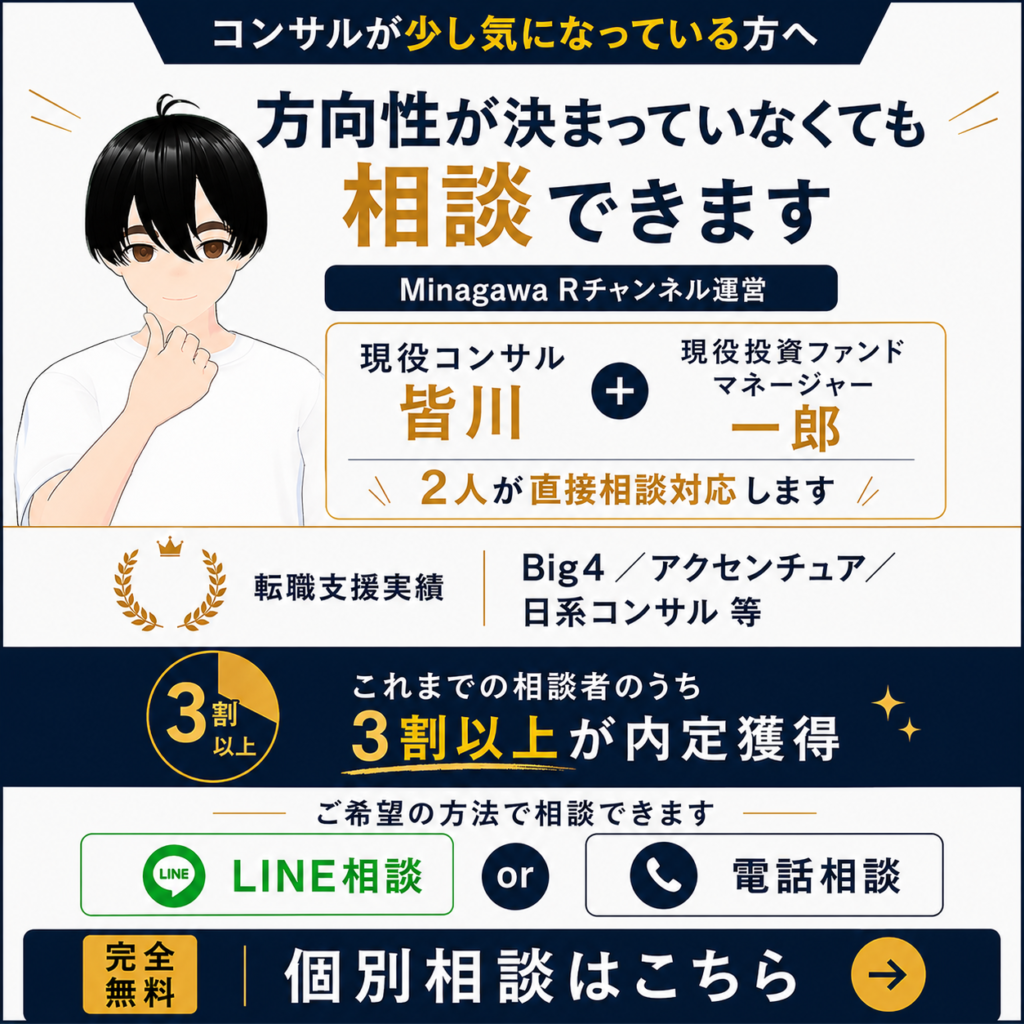 皆川Rチャンネル皆川、投資ファンド勤務者一郎へBig4/ベイカレ等総合コンサル、ITコンサルへの無料転職支援依頼!